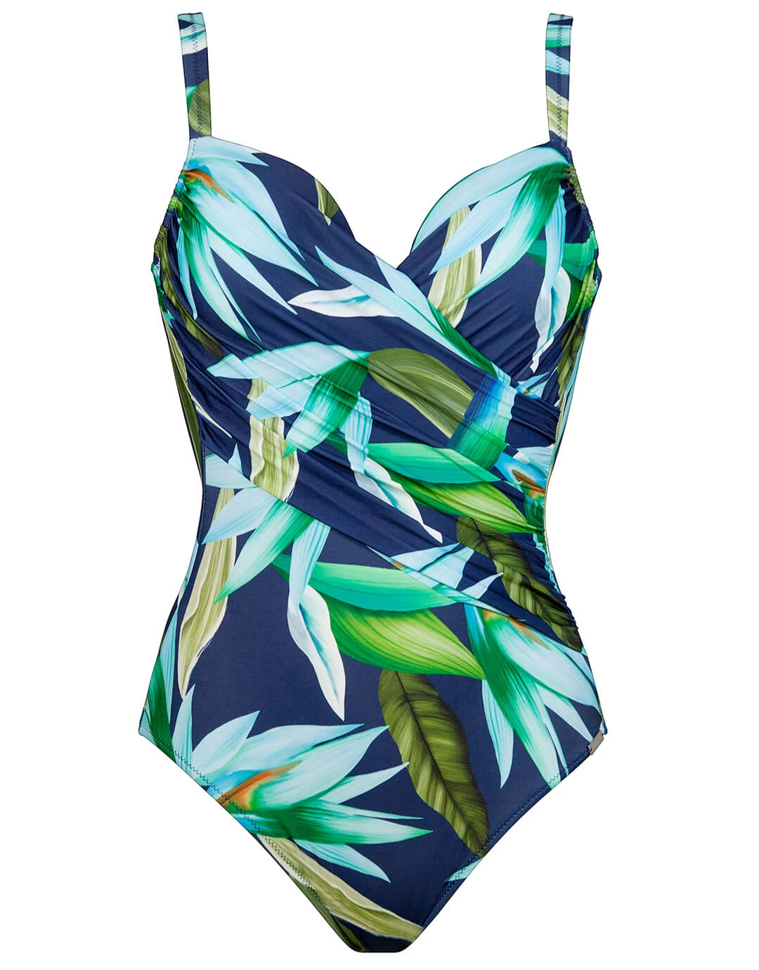 The Ocean Bloom Underwired swimsuit from Charmline is a wonderful green and aqua bird of paradise print on deep blue base. This underwired style has a wrap at the front, light tummy control, soft padded cups and adjustable straps.
