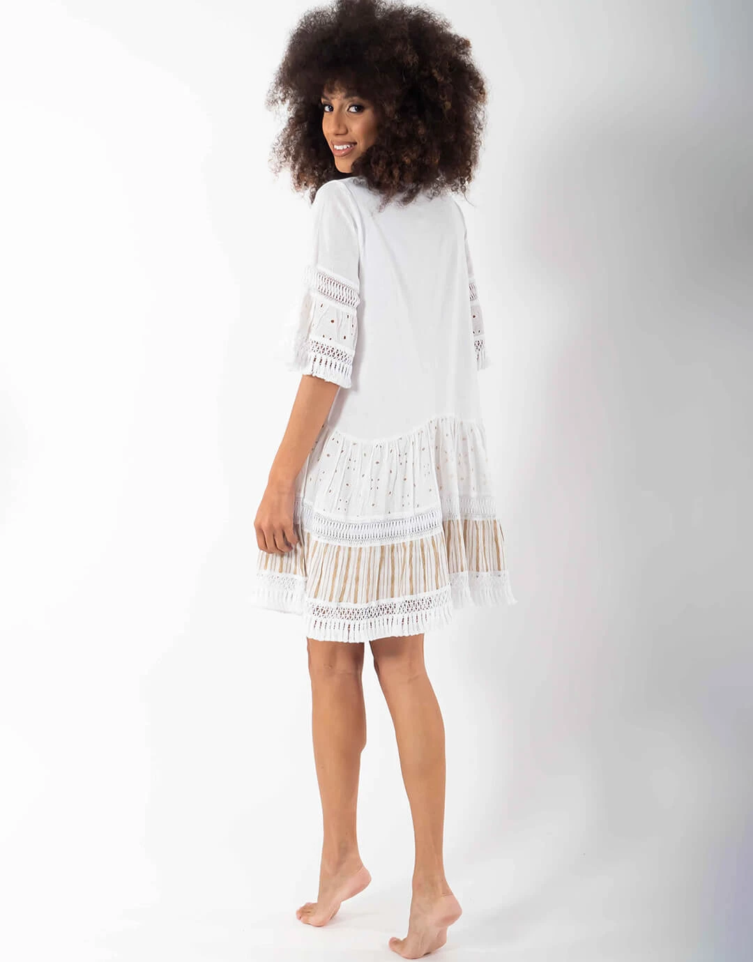 Stay chic on the beach with this crisp white cotton Erika dress by Iconique. With nude tone embroideries throughout and a buttoned front top, this A-line, flowy dress is a perfect addition to your summer wardrobe for a relaxed and bohemian look.