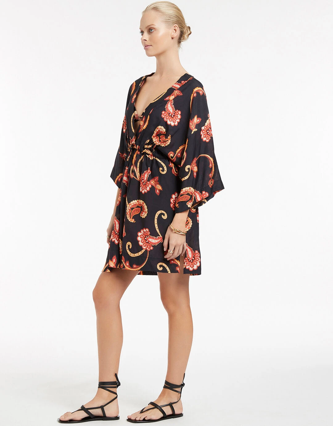 The Silk Road Wide Sleeve kaftan from jets is a lovely mini-length kimono style kaftan with wide sleeves, a deep V neck, side slits and an adjustable tie at the waist.