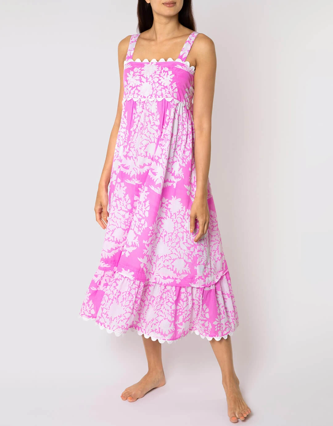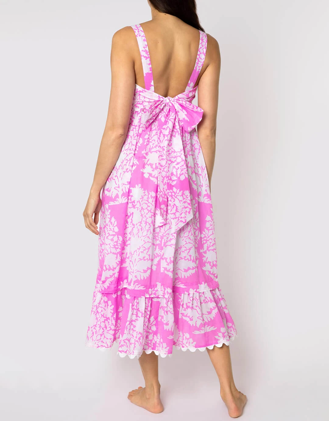 The pretty Palladio Print Bow Back dress from Juliet Dunn is a super hand-printed pink and white midi length style with square neckline and wide straps. The dress has an invisible zip fastening to one side and a large bow tie at the back to adjust.