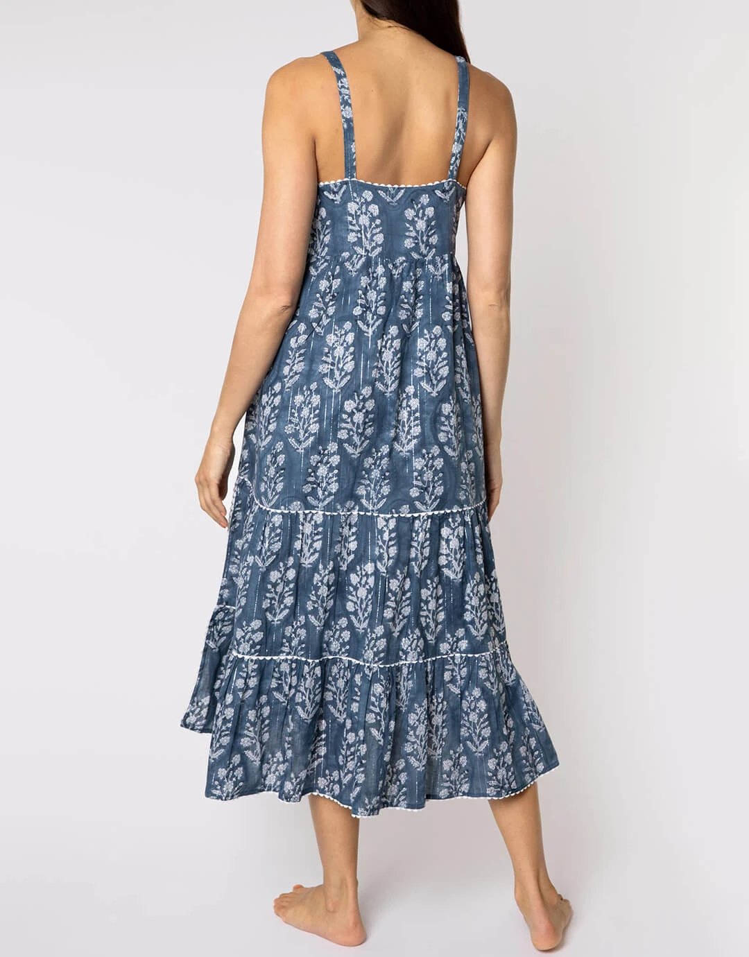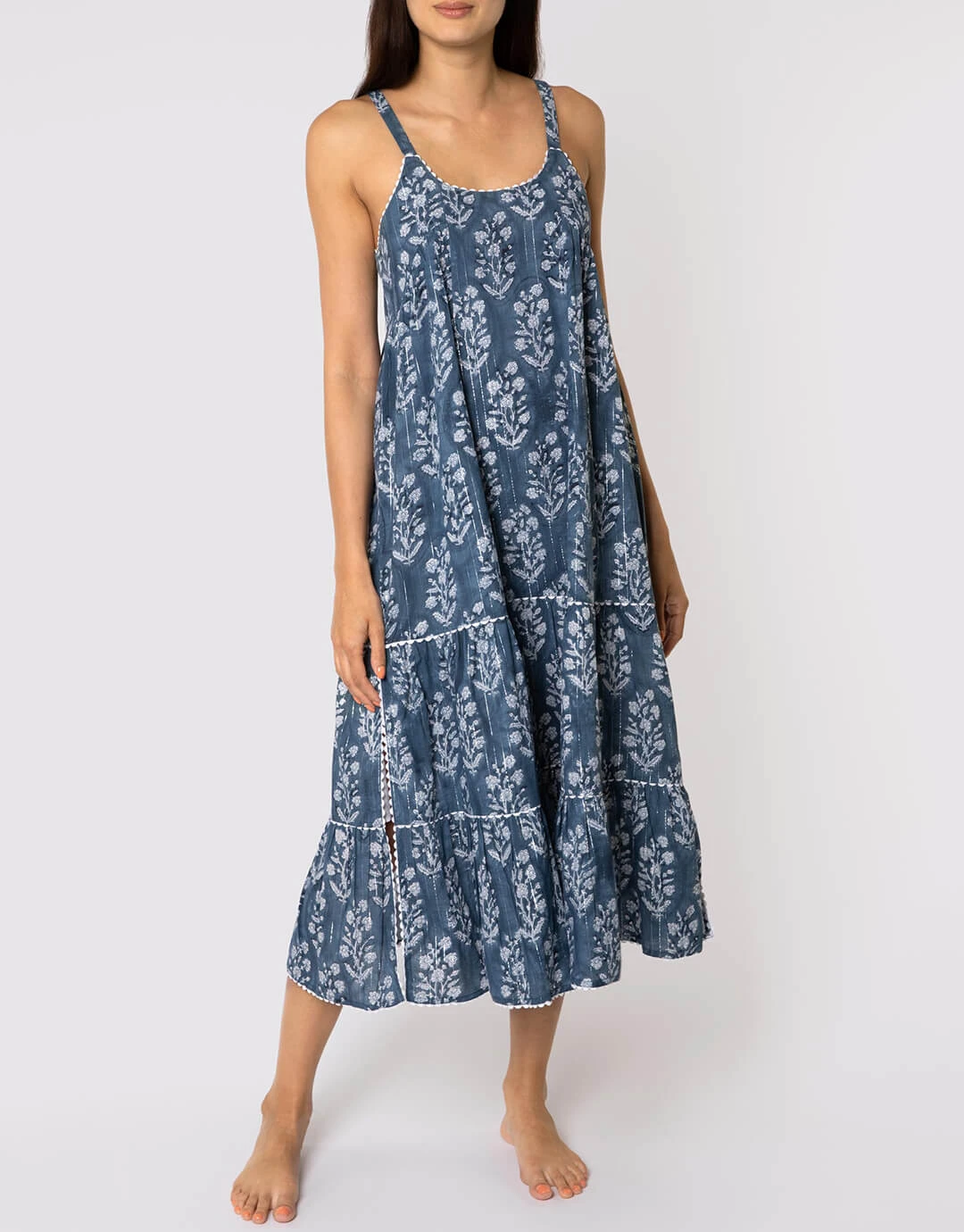 The Small Flower Block Print Swing Dress in Midnight blue from Juliet Dunn is a midi length dress with a tiered skirt, a scoop neck and narrow straps and side slits to the thigh. Hand printed with white flowers and delicate silver thread stripes in the fabric to catch the light.