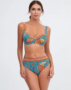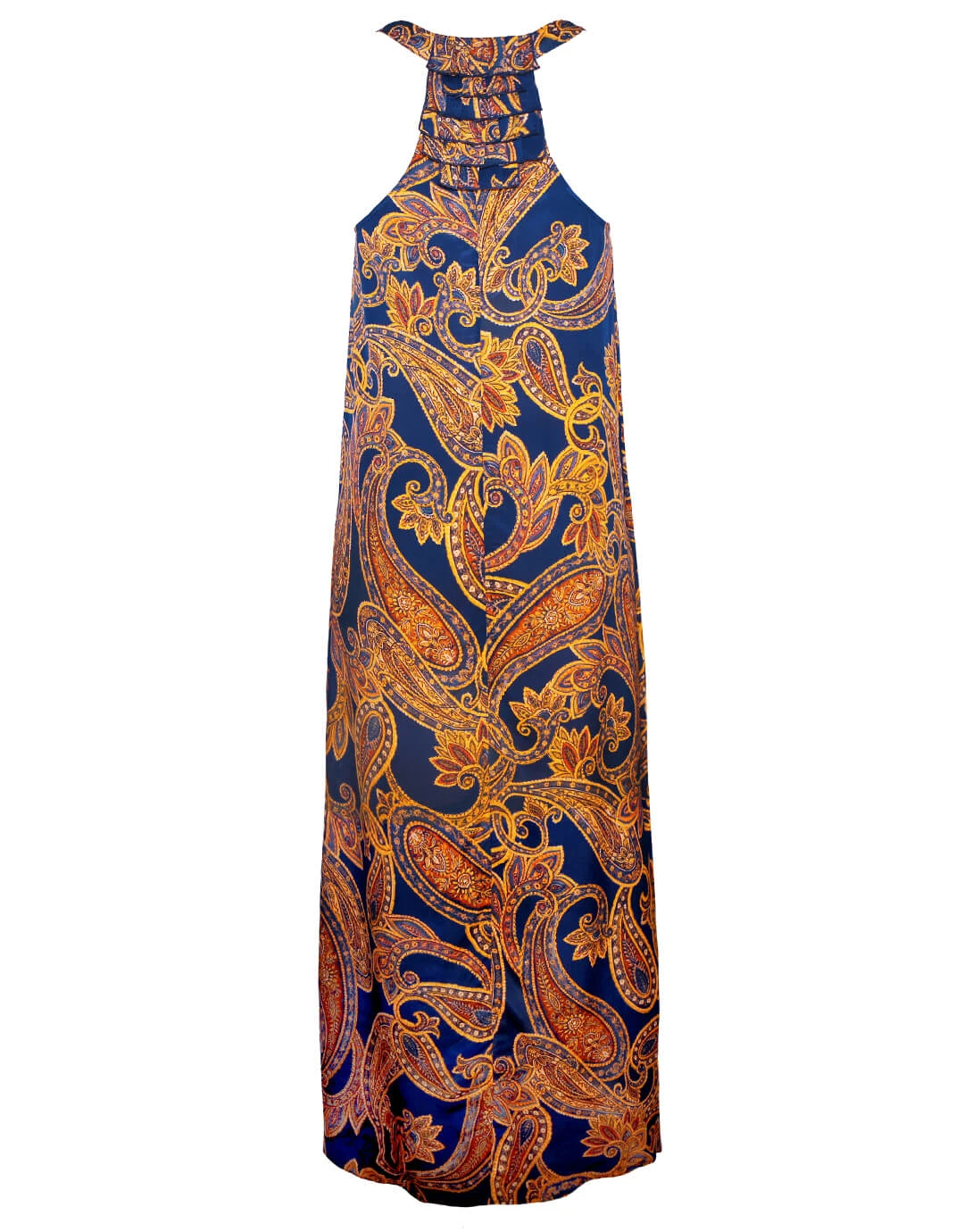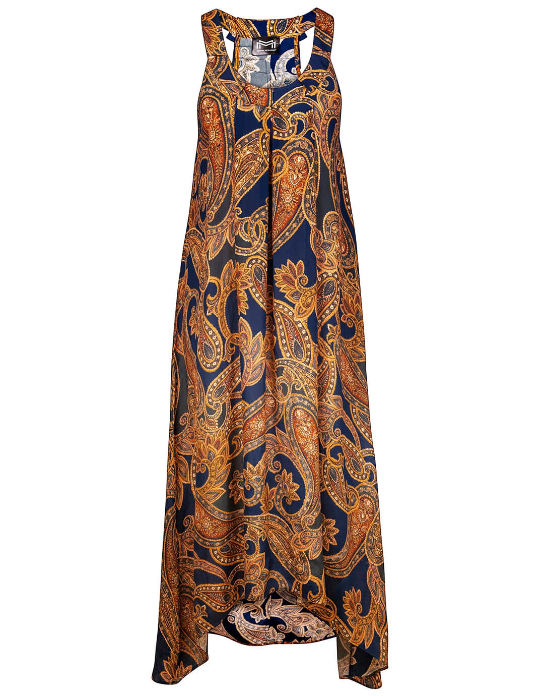 The Memory Maxi Dress from Maryan Mehlhorn in soft silk viscose fabric is a beautiful navy and warm sunset print of paisley swirls and ethnic and oriental vibes. Sleeveless and maxi-length with a high-low hemline, a round neck and a pretty Pierrot style layered detail at the back.