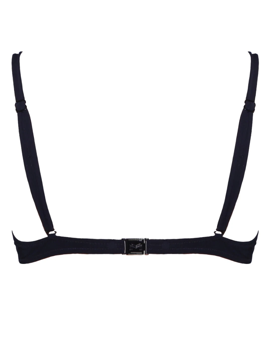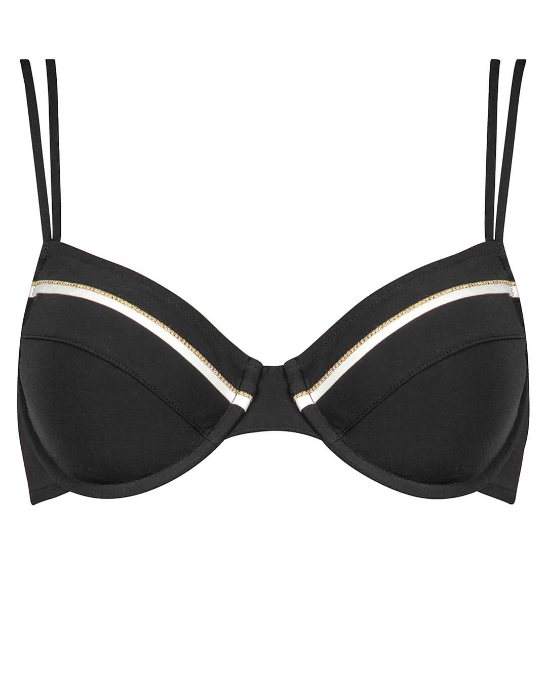 The Metrics Underwired bikini top from Maryan Mehlhorn is a super black bikini top with double straps at the front and a white and gold detail band on the cups. The cups are underwired and the straps are adjustable.