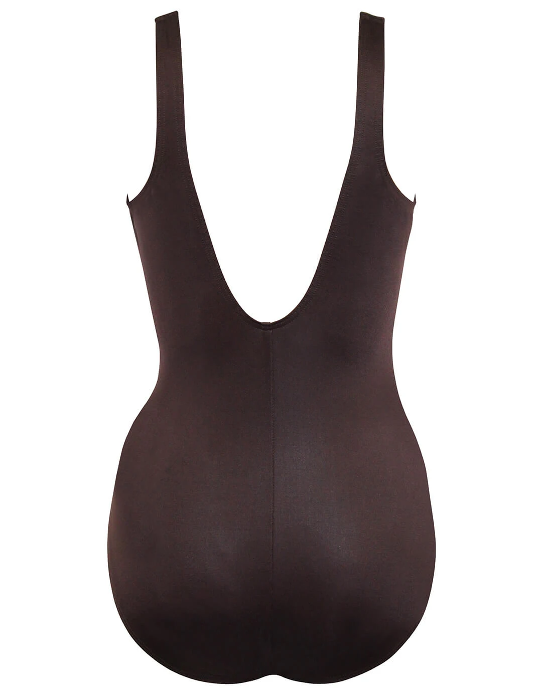 The Circe swimsuit from Miraclesuit is a lovely plunge front style with a draped wrap over the bust finishing to one side with a twist detail and at the other side with a mesh panel creating a fabulous slimming effect. The Illusionist design is a classic look in in chocolate brown with a mesh insert.