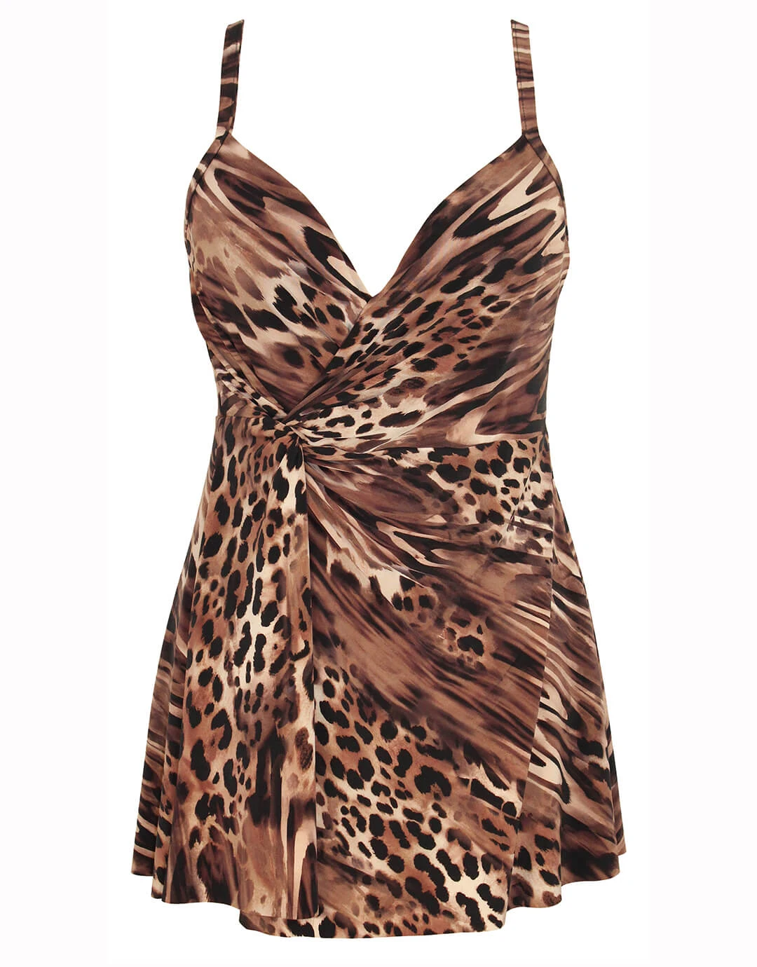 The Adora swimdress from Miraclesuit is a very feminine full control swimsuit with the addition of a light skirt with side slit. With soft underwired cups and narrow adjustable straps, this draped suit offers a little more coverage and is super flattering in the warm tones of this Ocicat animal print version.