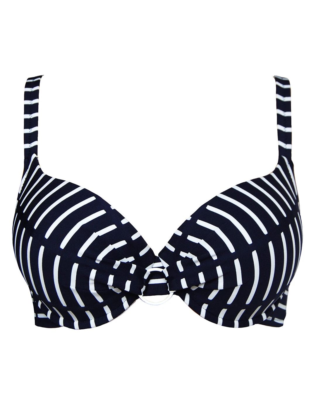 The Capri Plunge Bikini top from Nuria Ferrer is a lovely optical stripe design in blue and white, with soft moulded cups, underwire, a clipback and adjustable straps. With a ring detail at the centre front, this is a supportive style which gives a great shape.