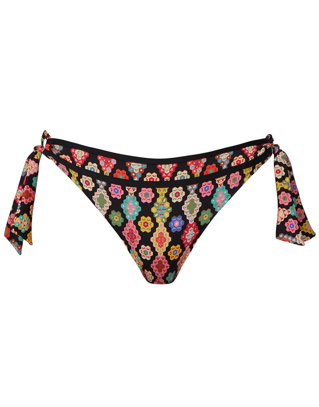 The Desiree Tie Side bikini pant from Nuria Ferrer is a pretty multicoloured tile design print style with moderate coverage and wide tab ties to the sides.
