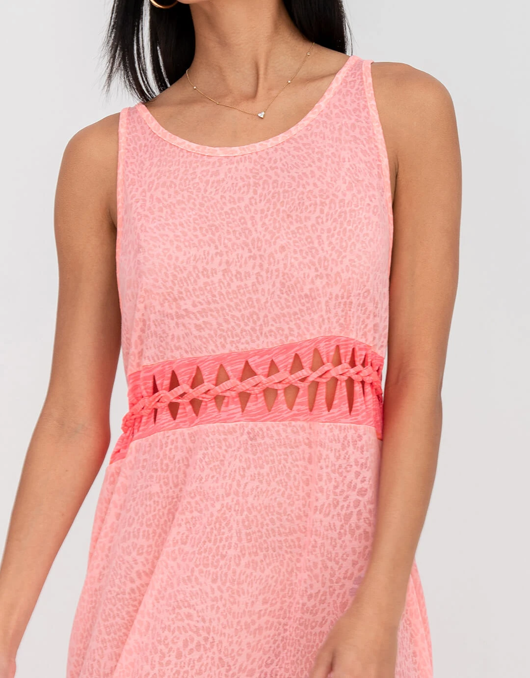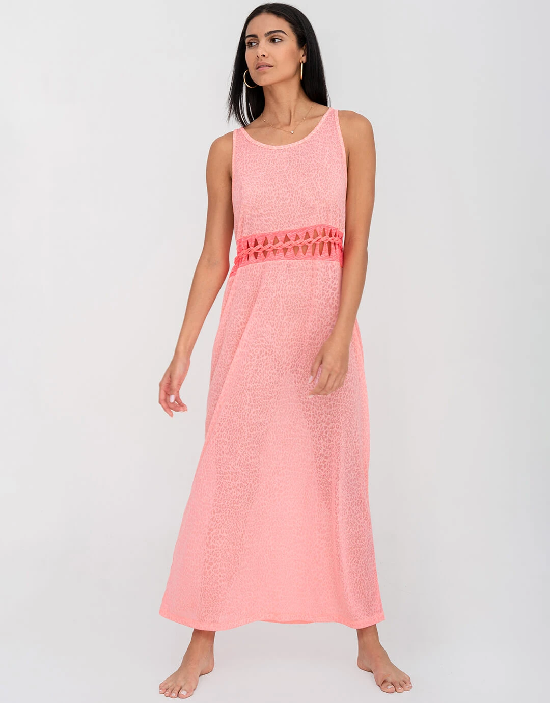 The Contrast Braid Cut Out dress in salmon pink from Pitusa is an ankle-length style in Pitusa’s signature lightweight burnout fabric, detailed with a cutout waistline in a contrasting fabric.