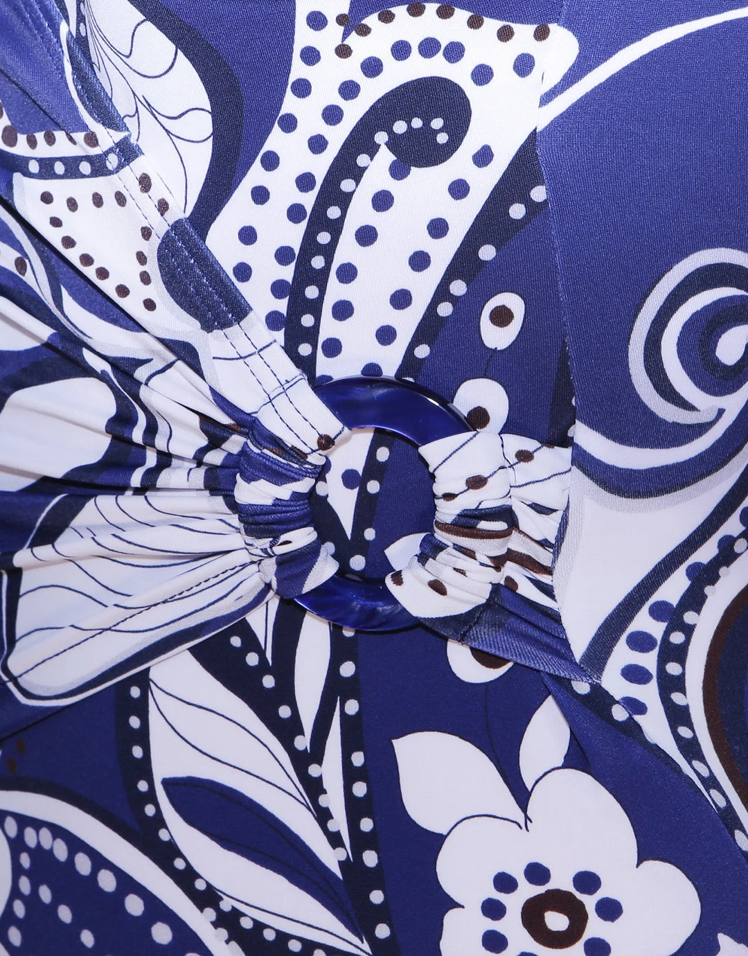 The stunning Cachemire Wrap Front swimsuit from Roidal is a beautiful blue and white print style with soft cups and a crossover front coming together in a ring detail to the side.