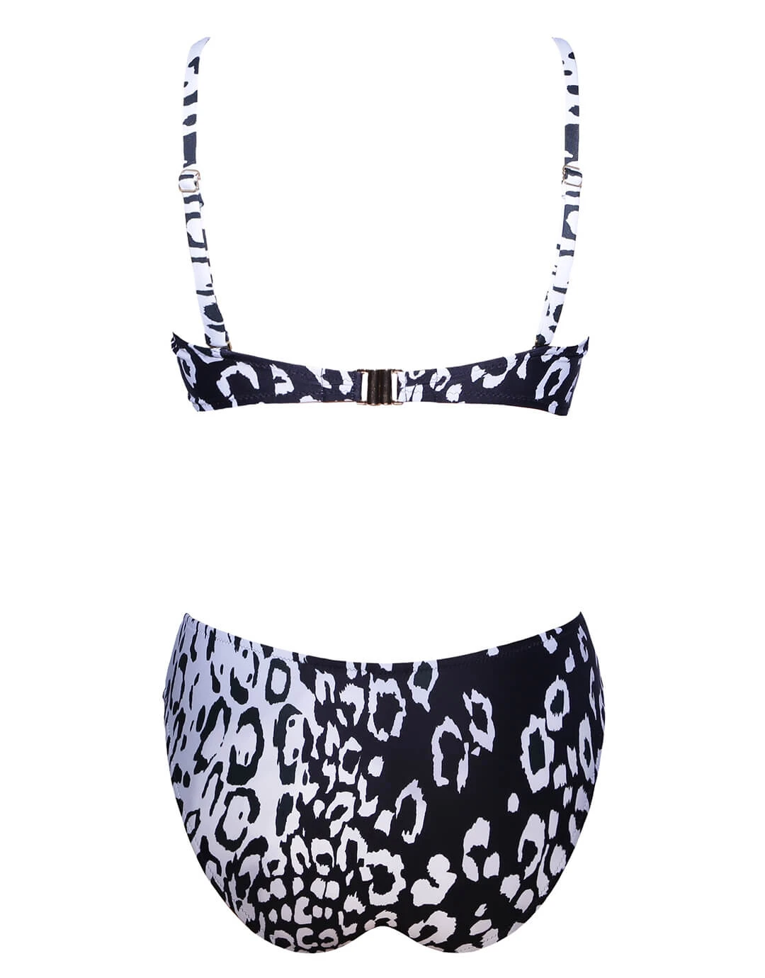 The Kalina Ruched Bandeau bikini from Roidal is a beautiful black and white animal print style with ruched underwired cups, a clip back and optional straps combined with a classic good coverage bikini pant with gathered front.