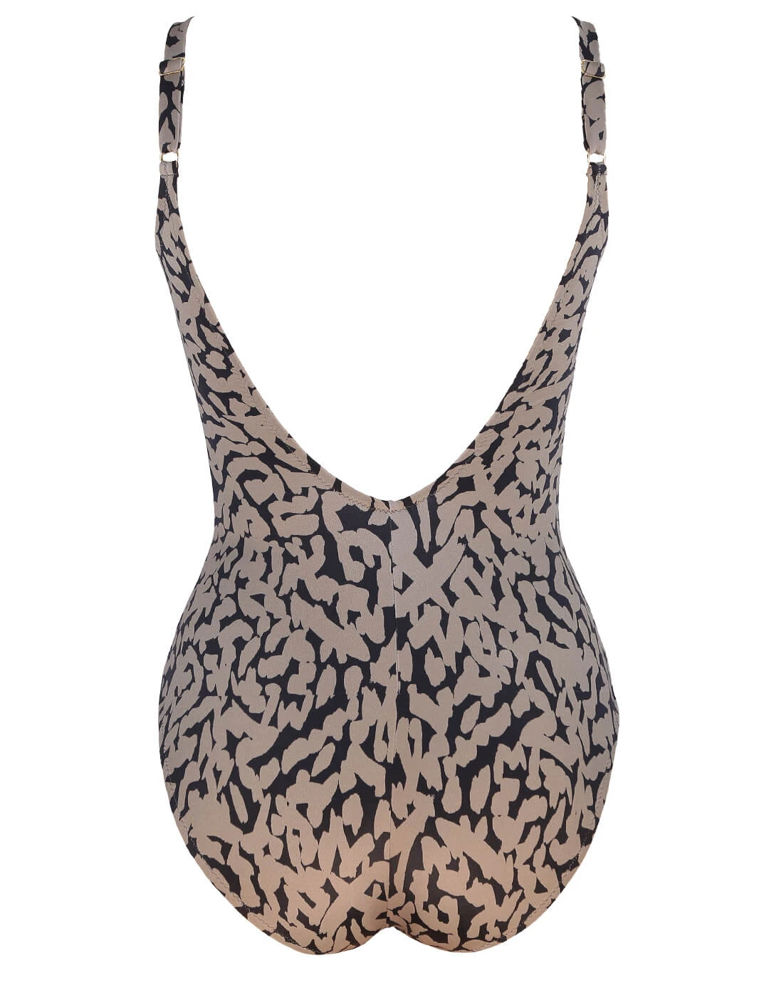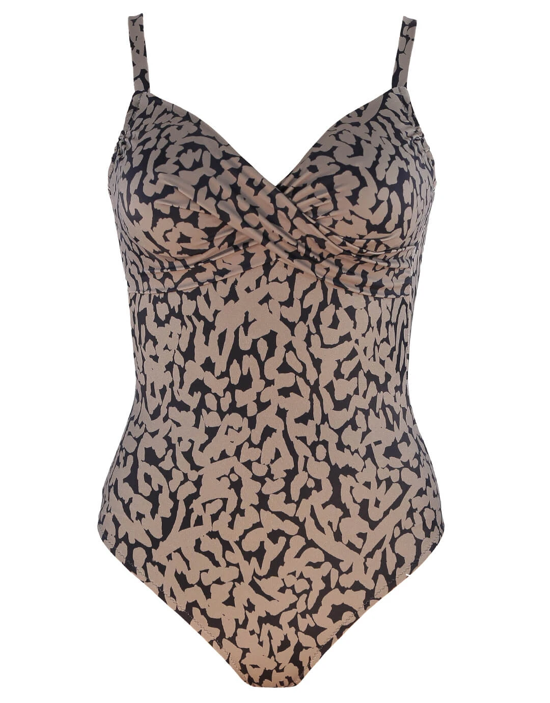 The Tattoo Underwired Crossover swimsuit from Roidal is a great dark taupe and black animal-inspired print. This classic Roidal crossover style has underwire, ruching and elastic on the sides of the cups for increased volume and adjustable straps.