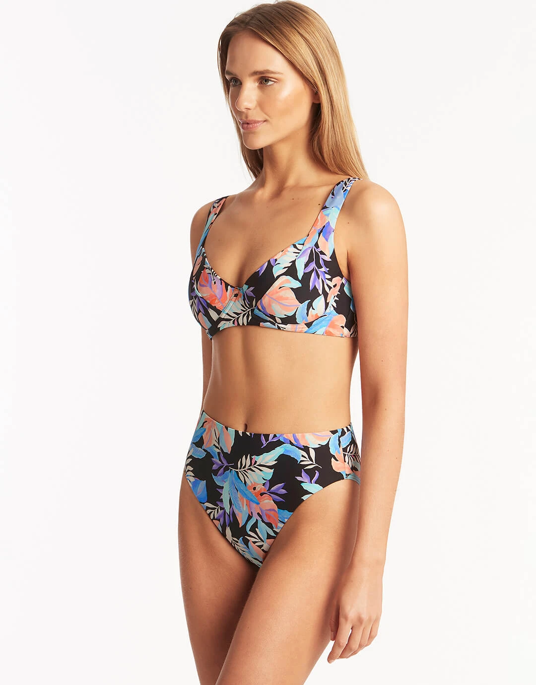The Botanica Underwired C/D cup bikini top from Sea Level Australia is a multicoloured floral on black base. In an underwired style with removable soft cups, side boning, an E-hook fitting at the back, powermesh and adjustable and convertible straps.