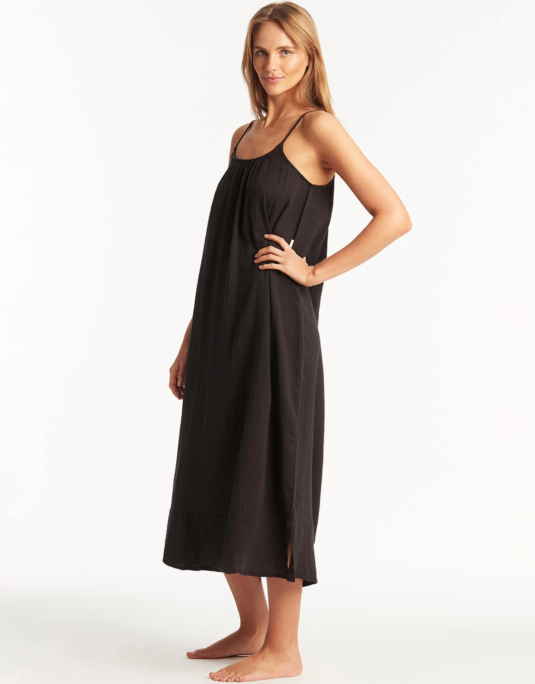 The Sunset Sun Dress from Sea Level Australia is a simple midi length cotton dress in black with narrow straps, gathers at the neck and an extra strap across the back.