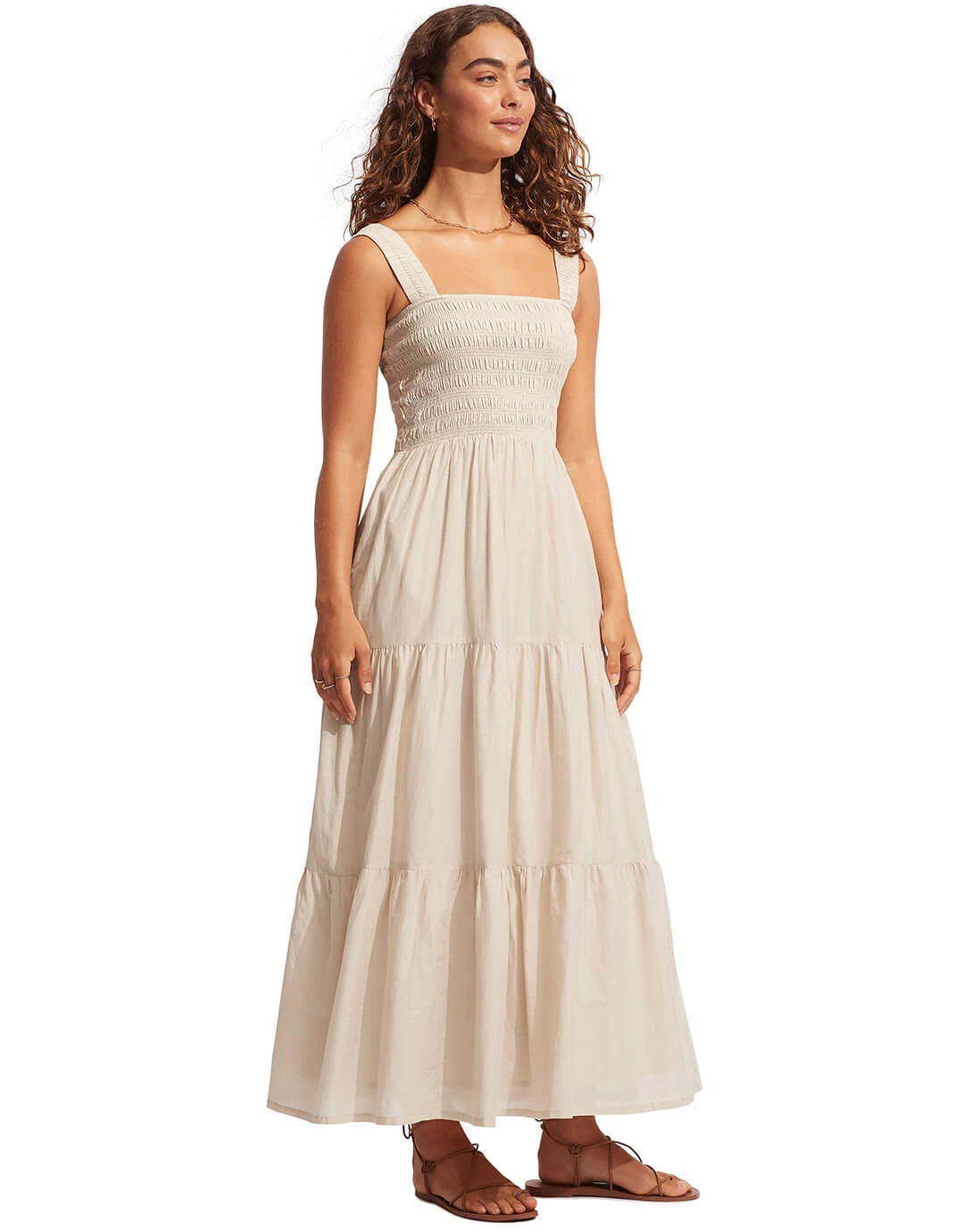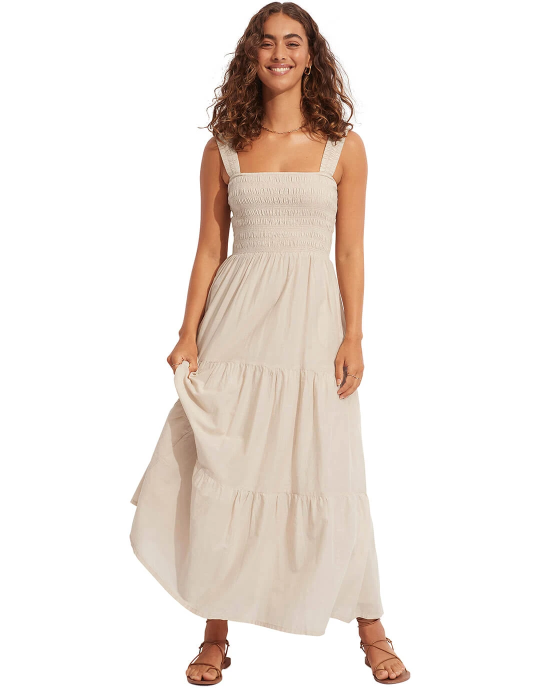 The Faithful Midi dress from Seafolly is a lovely natural beige summer dress with an elasticated smocked bodice and wide shoulder straps, a midi length tiered skirt and in-seam side pockets.