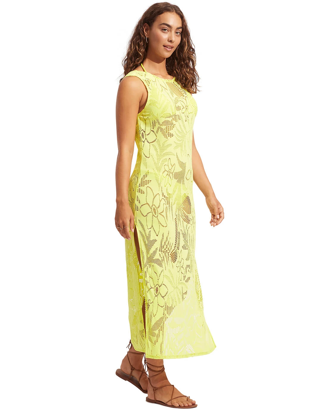 The Islands cover up from Seafolly is a pretty stretch lace effect, maxi length sleeveless dress cover-up with high side slits and a low back.