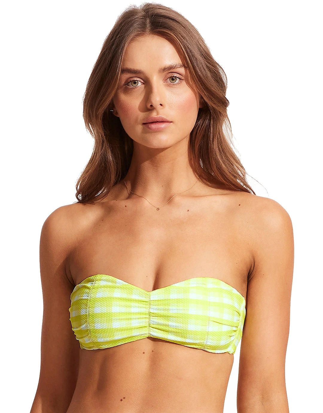 The lovely Portofino Ruched Bandeau bikini top from Seafolly is a fresh lime and white gingham print top with ruched and gathered cups. Inside there is side boning, gripper tape, removable cups and the back fixes with a clip.