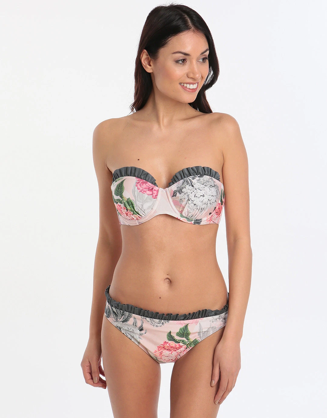 Fall in love with the underwired Ted Baker Palace Gardens Moulded Bikini Top in an elegant pink and grey floral print, finished with a statement black frill trim.