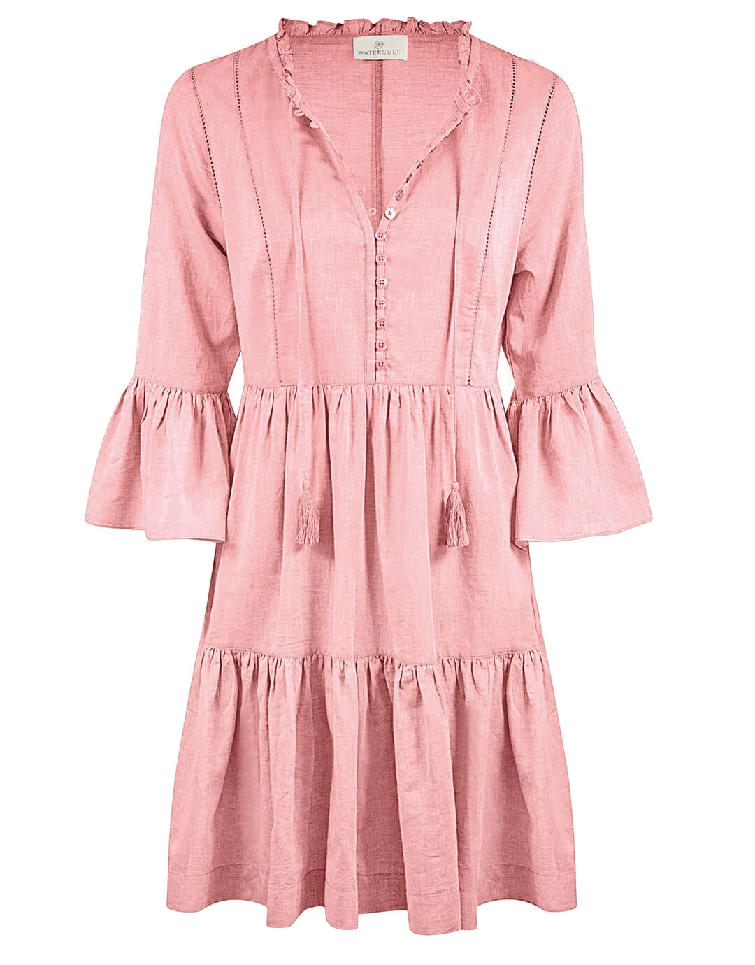 This pretty Chalky Pink dress from Watercult has a tiered skirt, wide flounce sleeves, buttons to the waist and tasselled ties at the neck.