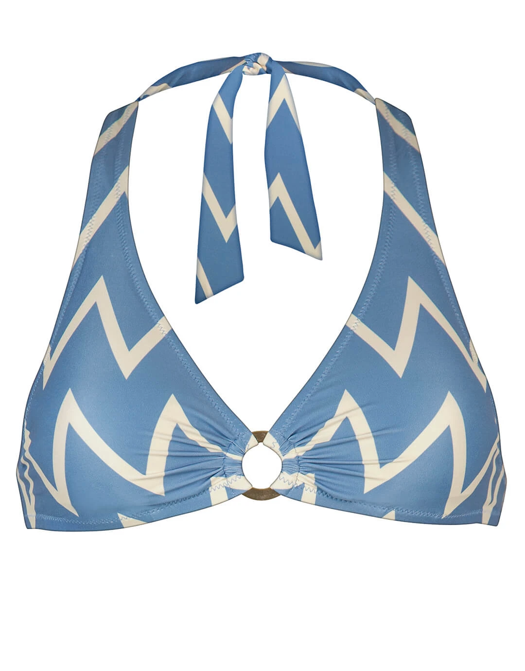The Seaside Vacay Halter bikini top from Watercult is a super blue and cream zig zag print halter style with soft padded cups, a ring trim at the centre and ties to the back and neck.