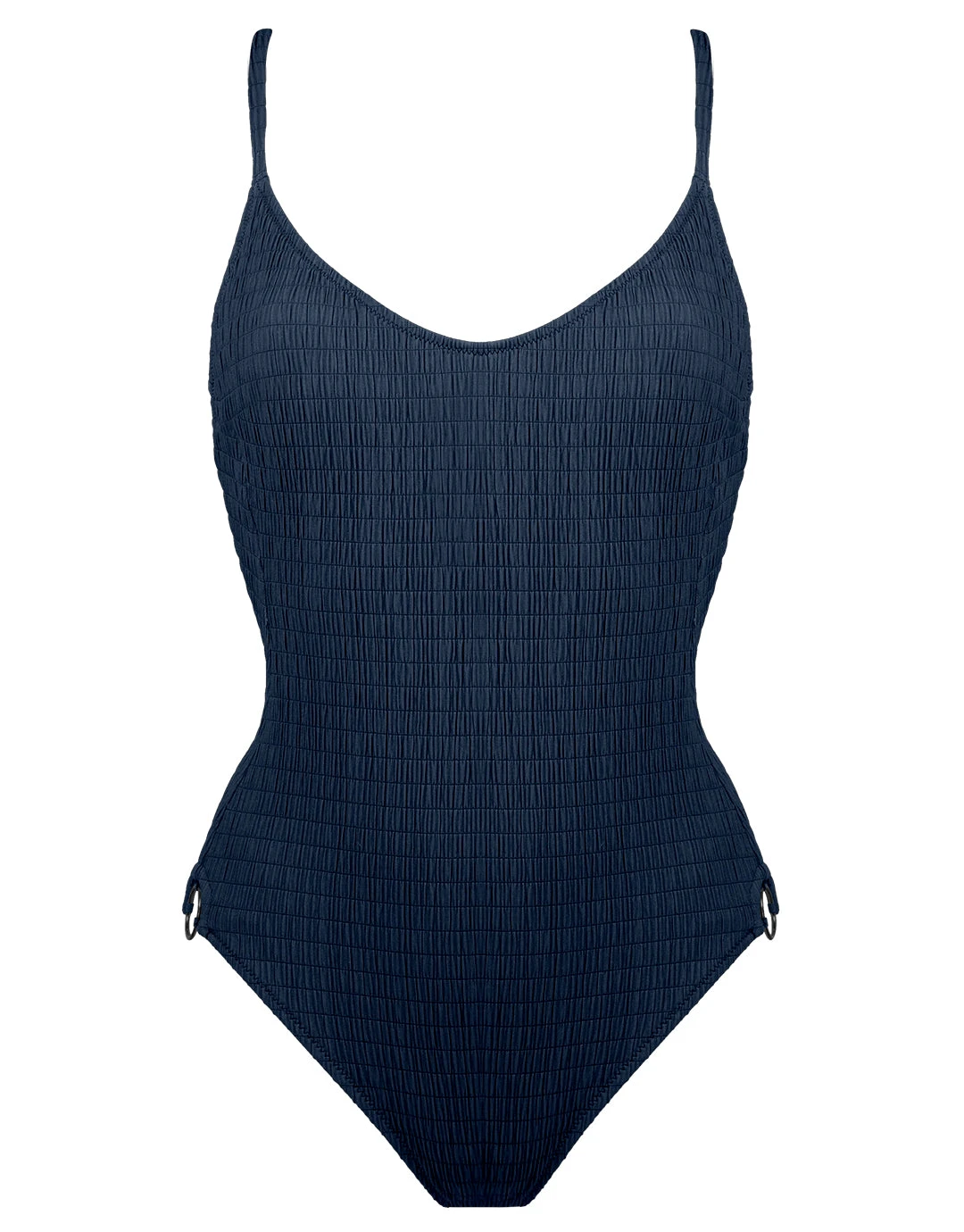 The Solid Crush swimsuit from Watercult is made from smocking textured stretch fabric. With a rounded neck, narrow adjustable straps which criss-cross at the back and ring detailing at the hips.